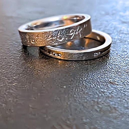 "Recently, Saffron meandered into In Bloom, and after taking in the artistry, style, and as a result of speaking to Stacey about having developed allergies and looking for new ring options, she knew she had found the right goldsmith and new long-term ring solution! It was time for Sarah’s ring to get an upgrade as well. Stacy envisioned how Saff’s ring could become Sarah’s ring while maintaining the symbolism of Sarah’s original, which had the imprint of the latitude and longitude halfway point of the distance that used to exist between them."