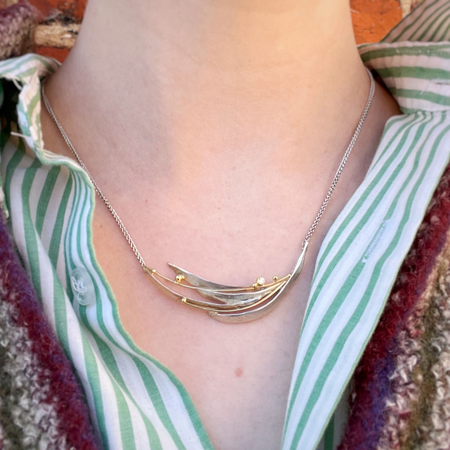 Drape a masterpiece of gold and silversmithing across your neck by donning our Tendrils Swoop Necklace. With hand-granulated details and a flowing, elegantly curved design, this unique necklace combines expert craftsmanship with artful, nature-inspired design. Rock solo or pair with our matching Flowing Tendrils Earrings.